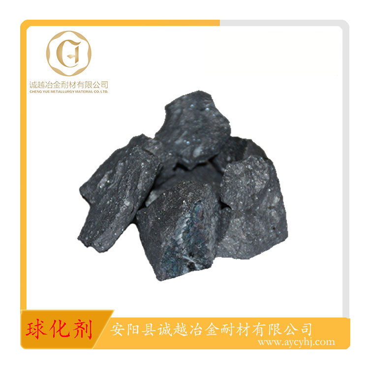 球化劑是使鑄鐵中的石墨呈球狀析出的鐵水添加劑。應用于鑄鐵鑄造領域。含鎂量4%、5%、5.5%屬于低鎂球化劑,RE在1%-2%之間,多用于中頻爐熔煉、低硫鐵液的球化處理。它具有球化反應和緩、球化元素易于充分吸收的優點。 含鎂量6%、7%屬中鎂系列球化劑,多用于沖天爐、電爐雙聯熔煉,或中頻爐熔煉珠光體型鑄態球墨鑄鐵鑄件。根據鑄件壁厚和原鐵水含硫量,確定合適的球化劑加入量,適用范圍廣,球化處理工藝寬泛。 高鎂系列球化劑,適合沖天爐熔煉、含硫量0.06%-0.09%的鐵液,加入量在1.6%-2.0%之間。 低鋁球化劑使用于容易產生皮下氣孔缺陷的鑄件,以及對鐵液含鋁量有要求的鑄件。 純Ce、純La生產的球化劑,球化處理后鐵液純凈夾雜物少、石墨球圓整。釔基重稀土生產的球化劑適合于大斷面鑄件,延緩球化衰退、防止塊狀石墨。含Sb球化劑用于珠光體型球墨鑄鐵。 低硅球化劑適用于使用大量回爐料的鑄造工廠;鎳鎂球化劑則用于高鎳奧氏體球墨鑄鐵。
